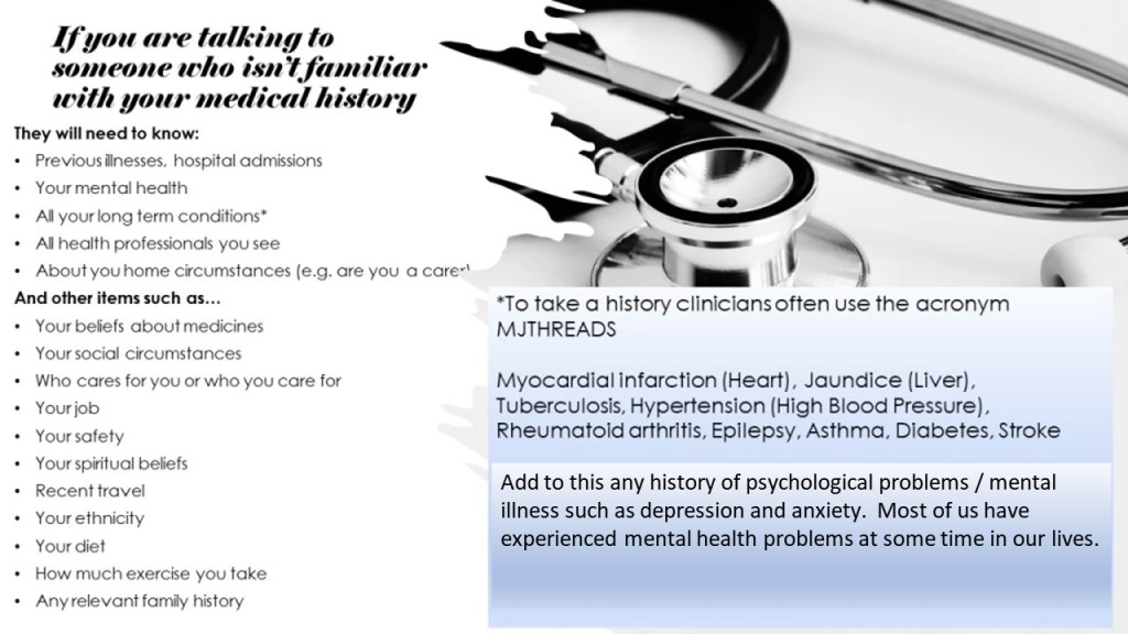 - All your long term conditions (the chart below shows an acronym ‘MJTHREADS’ used by clinicians). Alternatively it may be helpful to think of a ‘systems review’ in terms of a ‘body scan’, starting with the head.