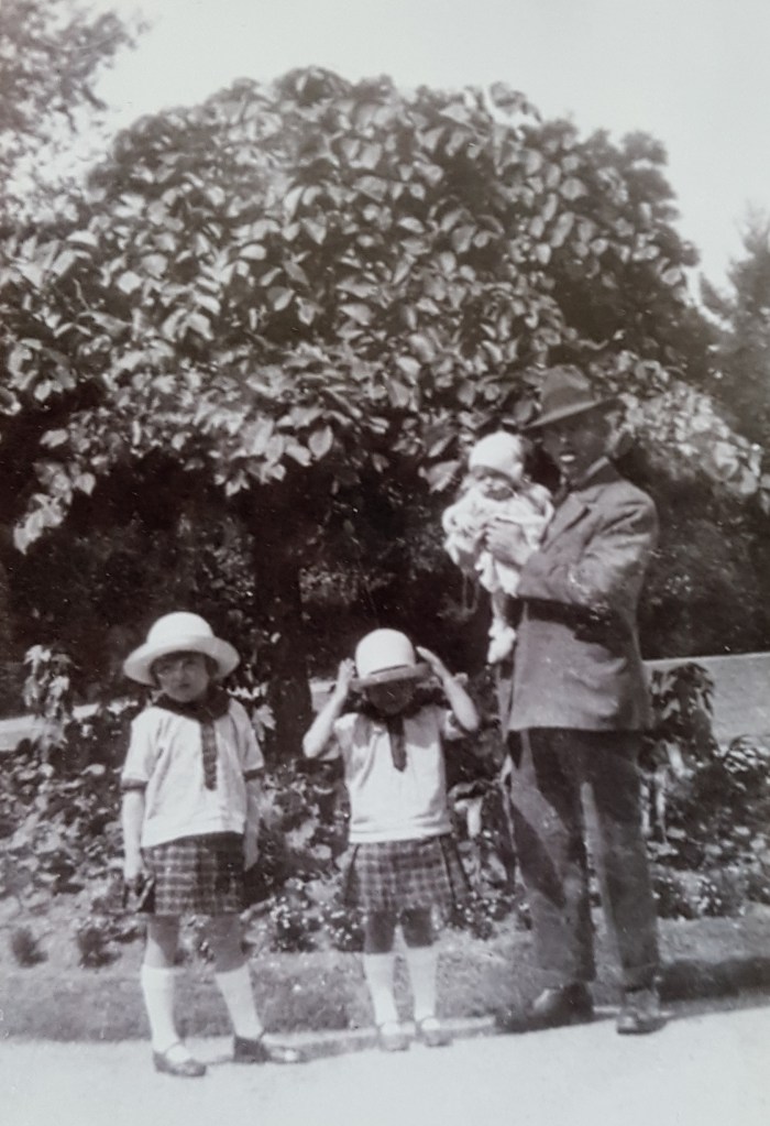 Another picture shows Mum and her older sisters, Olive and Joyce with mum in her dad William Bowers’ arms . Shortly after this my grandad William went into St George’s Hospital, where he remained until he died, about 30 years later. Mum can remember visiting him in the hospital as a young child. She described how there were many doors to unlock and how the attendants (this was before mental health nurses) were very kind to her and her mother.