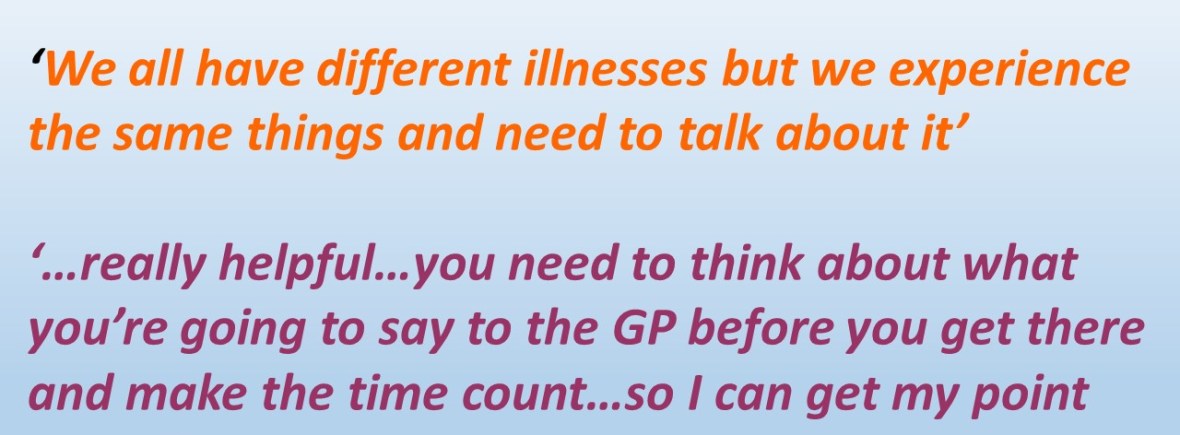 Thirdly, we’re finding some unexpected patient safety benefits. We’re learning that, as a result of the way the sessions are carried out, some people feel able to share information on their medicines and treatments with us that they haven’t previously shared with anyone. On a number of occasions, we have been able to give advice on medicines’ safety and signpost people to services they need but had previously either avoided or not been unaware of.