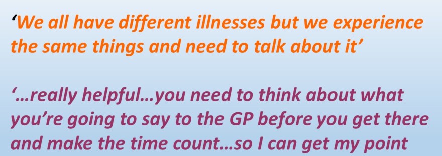 We provide people with their own notes in the form of a written action plan, which they can share with clinicians. We also give advice on trusted sources of information, on questions to ask doctors and we jointly develop group specific resource pages as a ‘spin off’ to this work.